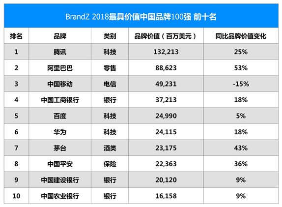 “BrandZ最具价值中国品牌100强”排名自2011年启动,是目前最权威、全面的中国品牌排行榜。根据评选规则,企业品牌最初是由中国大陆企业创建,隶属于上市企业,或其财务数据由全球大型会计师事务所审计并向公众发布(如未上市的华为),银行类品牌需要从零售银行业务获得至少20%的收益。这项调查不仅采用了彭博社和凯度消费者指数的财务数据,同时还结合通过访谈收集来的40多万名中国消费者的观点看法。